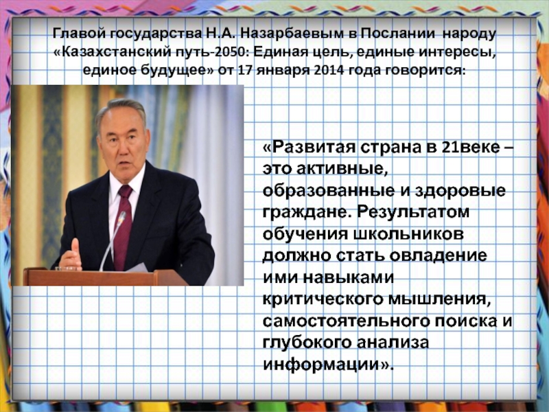 «Развитая страна в 21веке – это активные, образованные и здоровые граждане. Результатом обучения школьников должно стать овладение ими навыками критического мышления, самостоятельного поиска и глубокого анализа информации».
