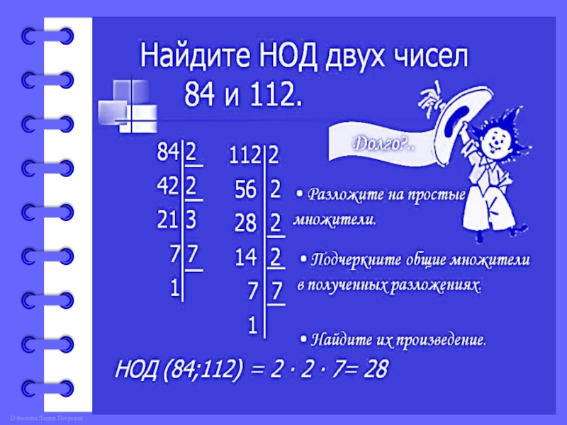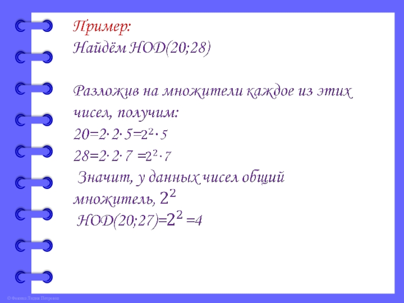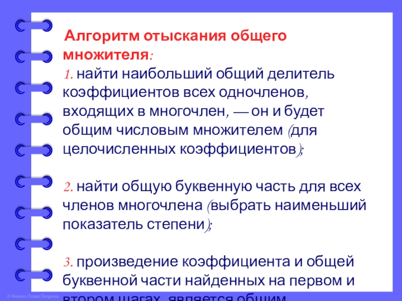 Алгоритм отыскания общего множителя:  1. найти наибольший общий делитель коэффициентов всех одночленов, входящих в многочлен, — он и