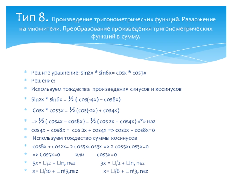 Тип 8. Произведение тригонометрических функций. Разложение на множители. Преобразование произведения тригонометрических функций в сумму.
