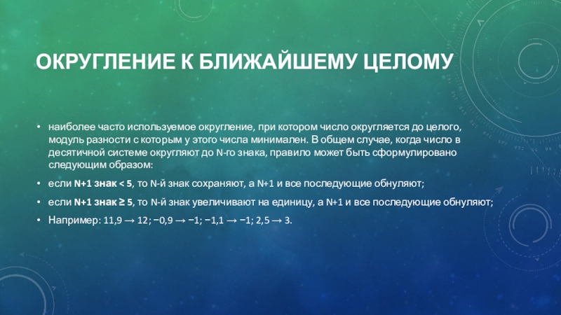 до целого, модуль разности с которым у этого числа минимален. В общем случае, когда число в десятичной системе округляют до N-го знака, правило может быть сформулировано следующим образом: