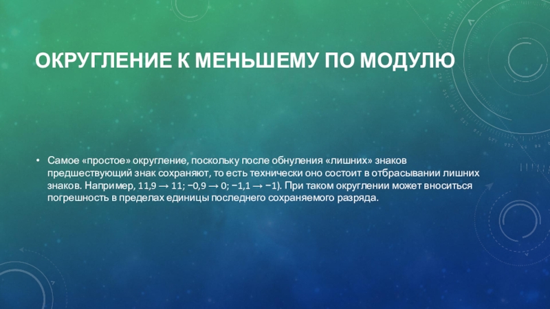 знаков предшествующий знак сохраняют, то есть технически оно состоит в отбрасывании лишних знаков. Например, 11,9 → 11; −0,9 → 0; −1,1 → −1). При таком округлении может вноситься погрешность в пределах единицы последнего сохраняемого разряда.