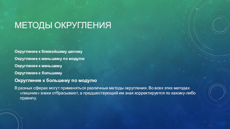 В разных сферах могут применяться различные методы округления. Во всех этих методах «лишние» знаки отбрасывают, а предшествующий им знак корректируется по какому-либо правилу.
