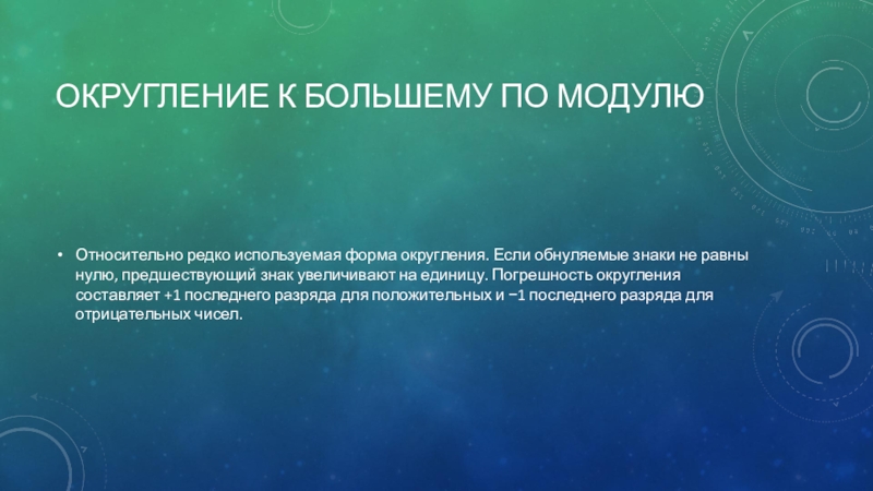 знаки не равны нулю, предшествующий знак увеличивают на единицу. Погрешность округления составляет +1 последнего разряда для положительных и −1 последнего разряда для отрицательных чисел.