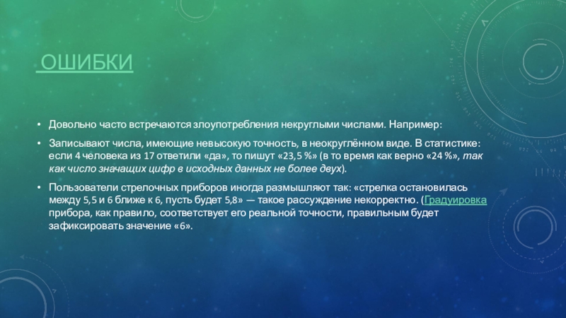невысокую точность, в неокруглённом виде. В статистике: если 4 человека из 17 ответили «да», то пишут «23,5 %» (в то время как верно «24 %», так как число значащих цифр в исходных данных не более двух).