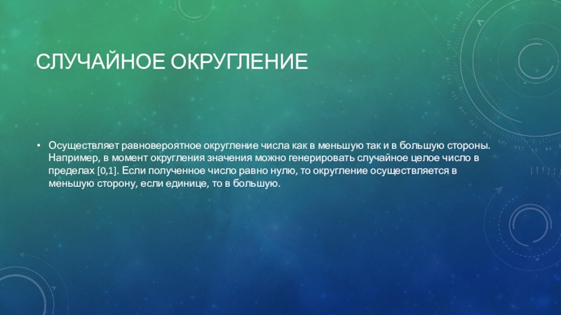 большую стороны. Например, в момент округления значения можно генерировать случайное целое число в пределах [0,1]. Если полученное число равно нулю, то округление осуществляется в меньшую сторону, если единице, то в большую.