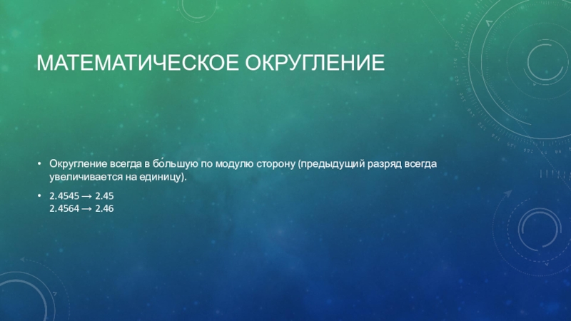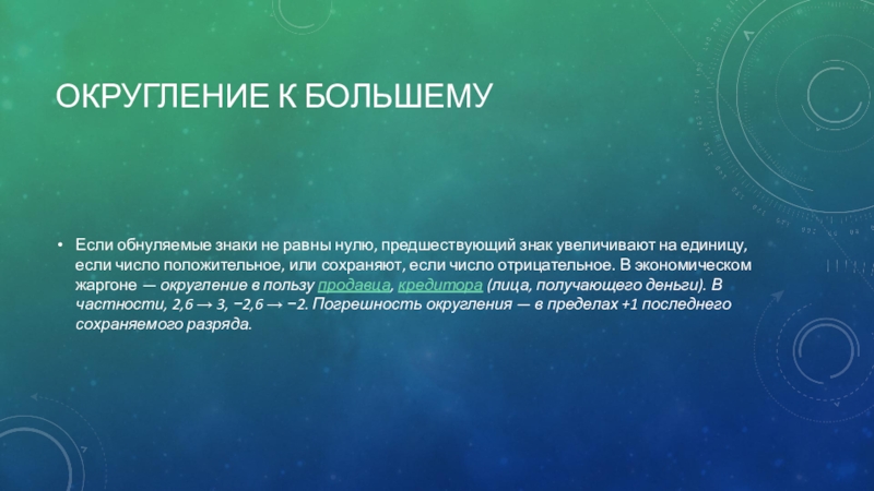 на единицу, если число положительное, или сохраняют, если число отрицательное. В экономическом жаргоне — округление в пользу продавца, кредитора (лица, получающего деньги). В частности, 2,6 → 3, −2,6 → −2. Погрешность округления — в пределах +1 последнего сохраняемого разряда.