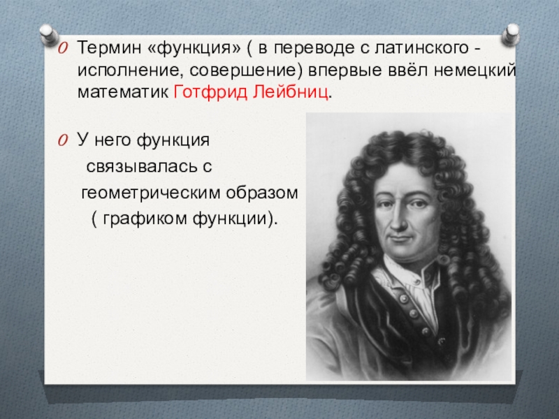 Термин «функция» ( в переводе с латинского - исполнение, совершение) впервые ввёл немецкий математик Готфрид Лейбниц.