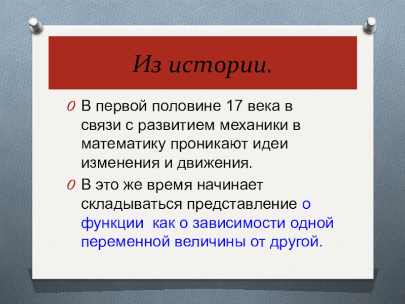 Из истории.В первой половине 17 века в связи с развитием механики в математику проникают идеи изменения и движения. В это же время начинает складываться представление о функции как о зависимости одной переменной величины от другой.