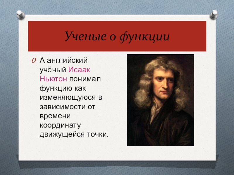 Ученые о функции  А английский учёный Исаак Ньютон понимал функцию как изменяющуюся в зависимости от