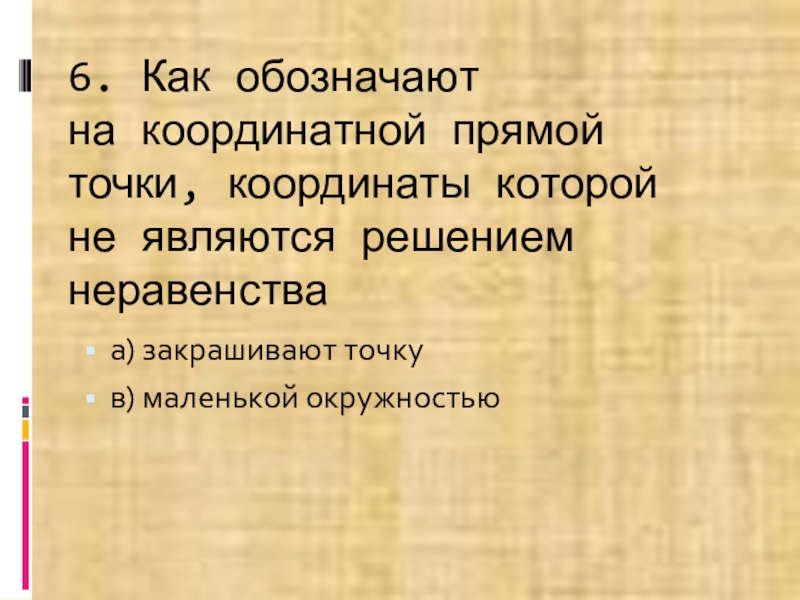 6. Как обозначают на координатной прямой точки, координаты которой не являются решением неравенства  а) закрашивают точкув) маленькой окружностью