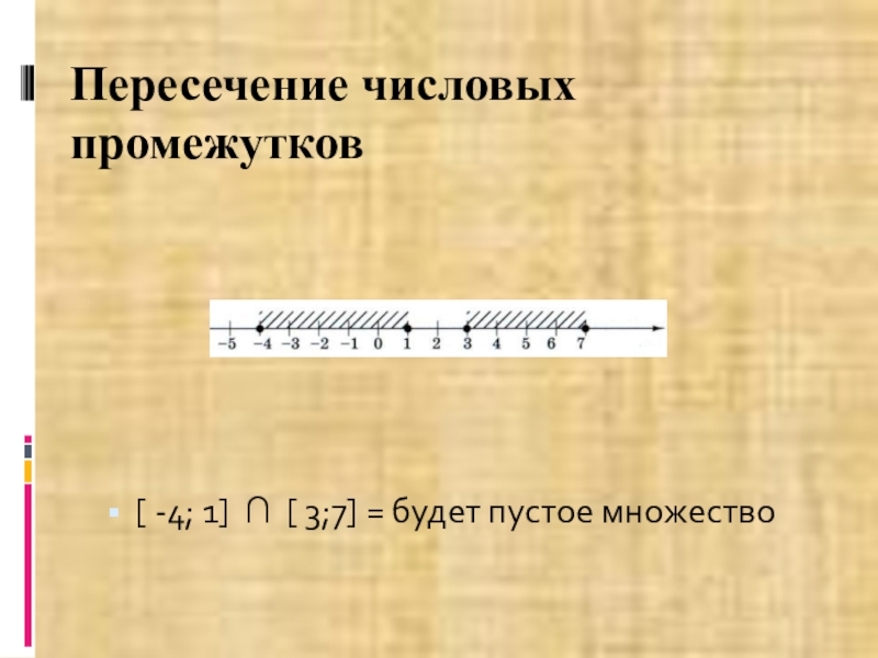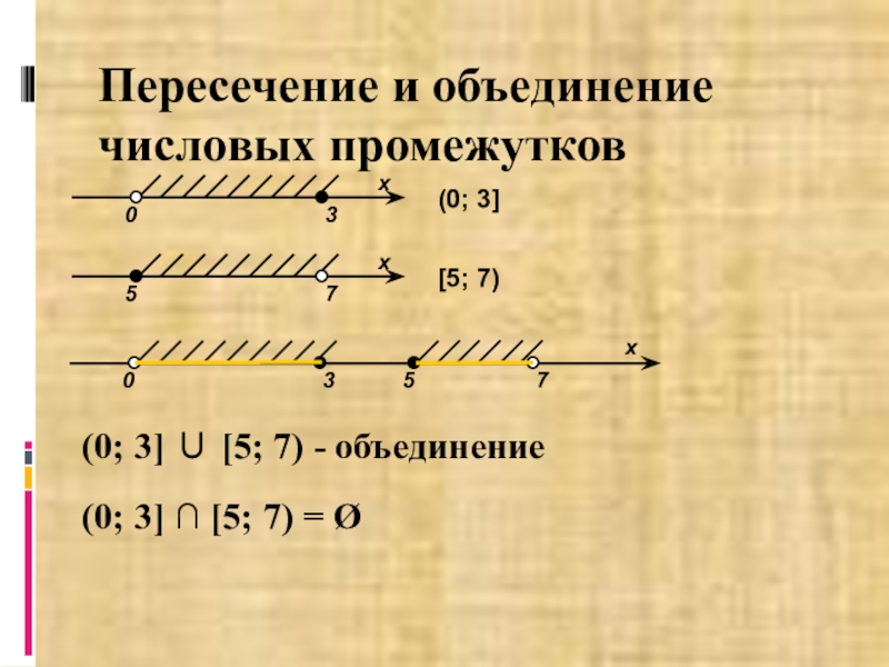 Пересечение и объединение числовых промежутков(0; 3] ∩ [5; 7) = Ø