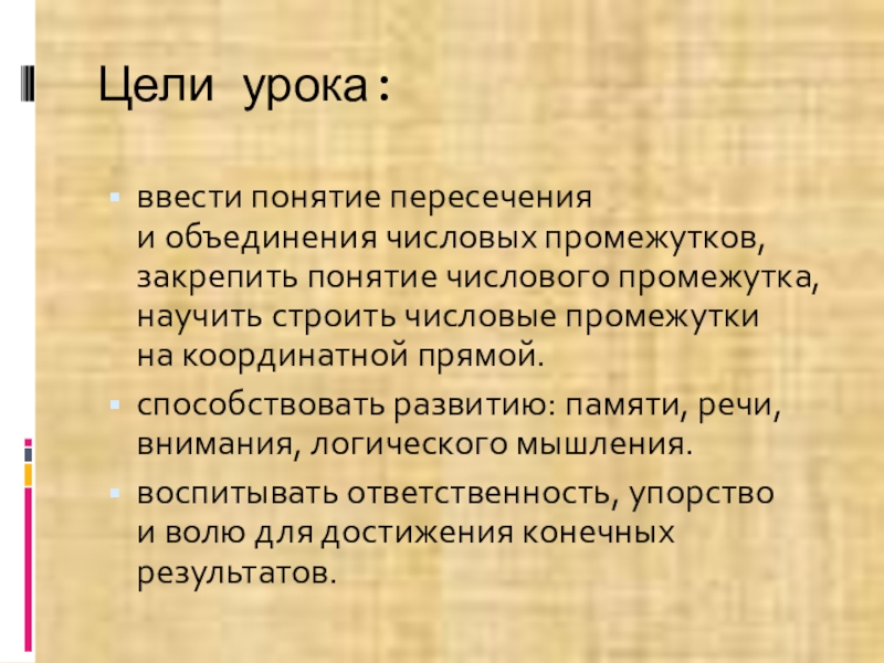 ввести понятие пересечения и объединения числовых промежутков, закрепить понятие числового промежутка,
