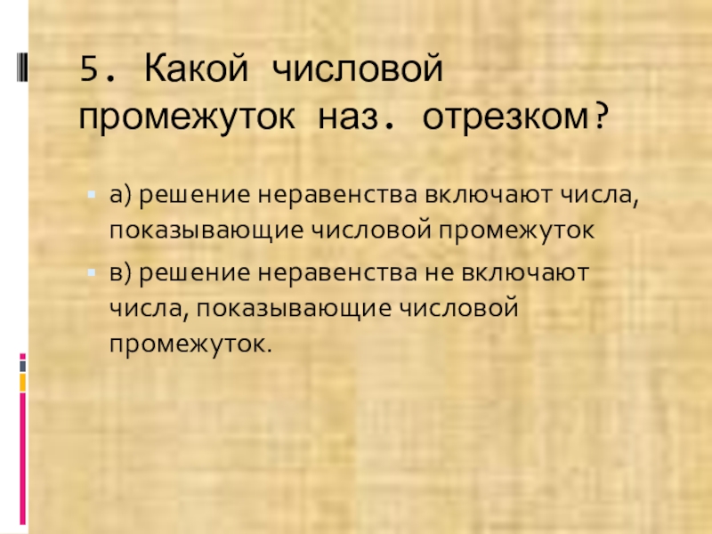 5. Какой числовой промежуток наз. отрезком?   а) решение неравенства включают числа, показывающие числовой промежутокв) решение