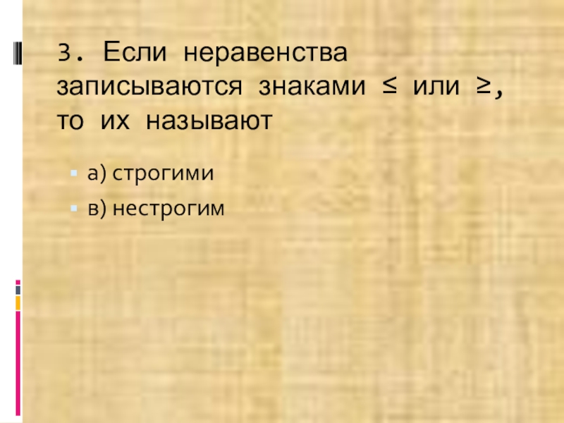 3. Если неравенства записываются знаками ≤ или ≥, то их называют 	 	 а) строгимив) нестрогим