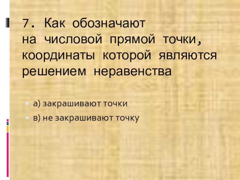 7. Как обозначают на числовой прямой точки, координаты которой являются решением неравенства   а) закрашивают точкив) не закрашивают