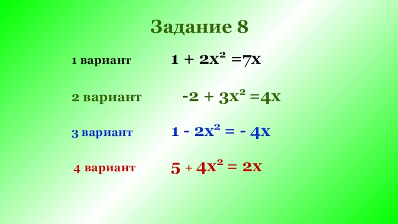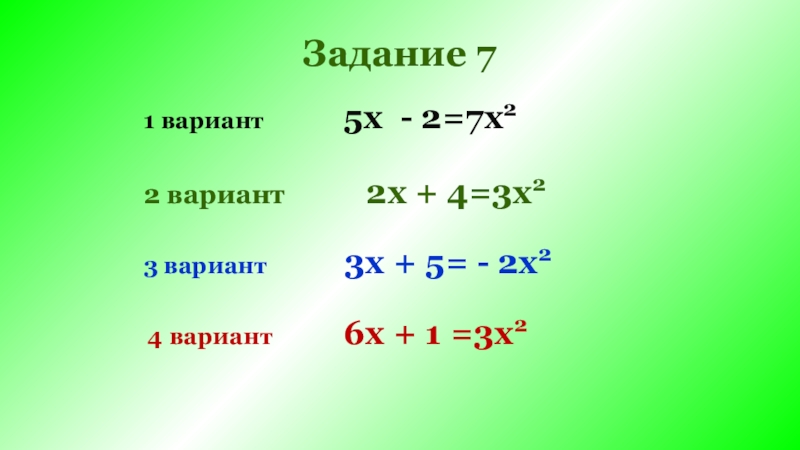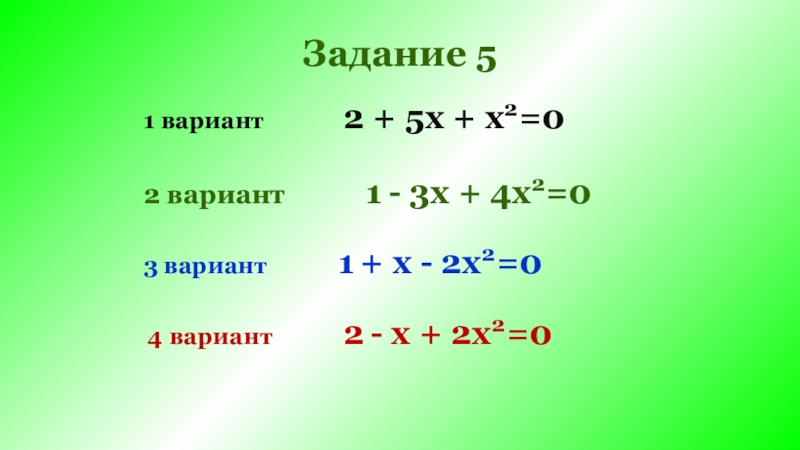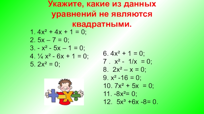 1. 4х² + 4х + 1 = 0; 2. 5х – 7 = 0; 3. - х² - 5х – 1 = 0; 4. ¼ х² - 6х + 1 = 0; 5. 2х² = 0;