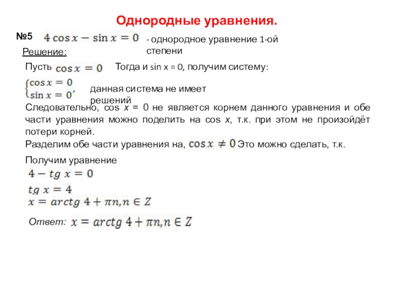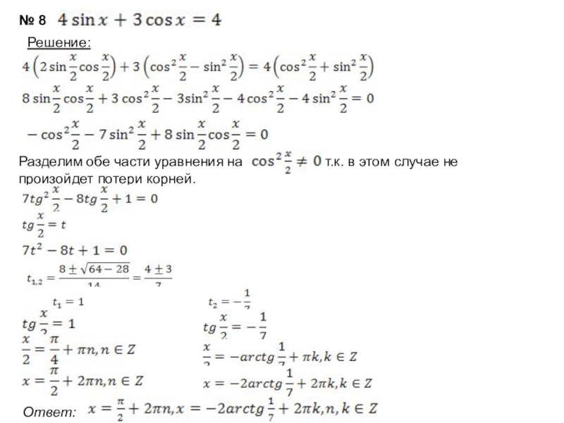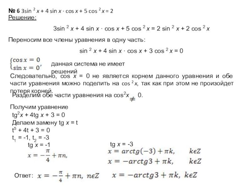 Следовательно, cos x = 0 не является корнем данного уравнения и обе части уравнения можно поделить на cos 2 x, так как при этом не произойдет потеря корней.