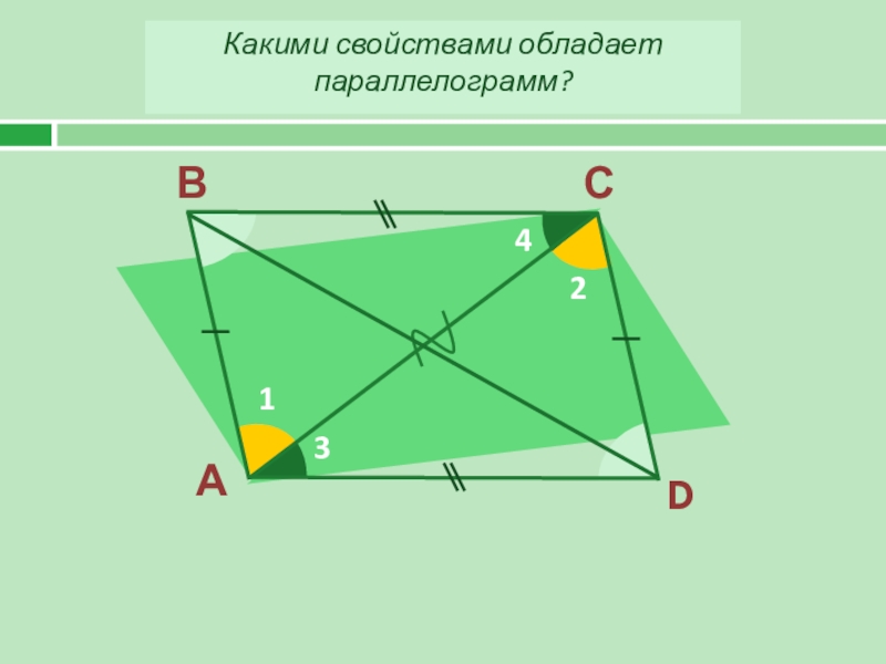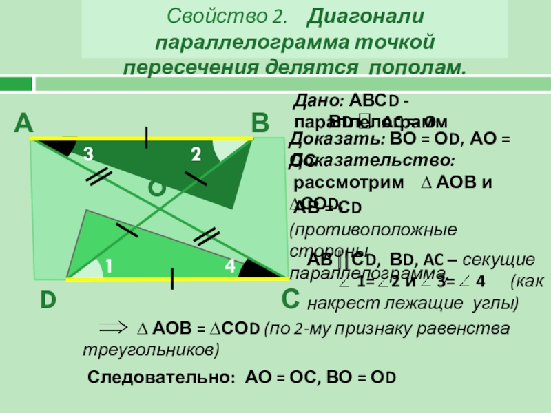Решение: по свойству параллелограмма ВО = ОD, ∠ ВОМ =∠ КОD – вертикальные ,