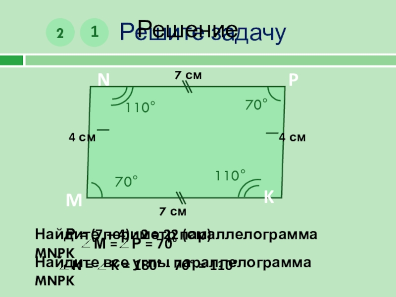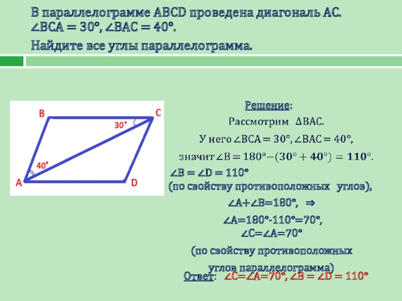 Ответ: ∠C=∠A=70°, ∠B = ∠D = 110°
