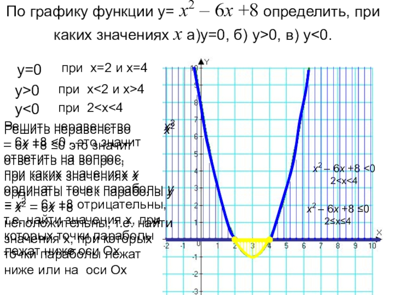 при каких значениях х ординаты точек параболы у = х2 – 6х +8 неположительны, т.е. найти значения х, при которых точки параболы лежат ниже или на оси Ох