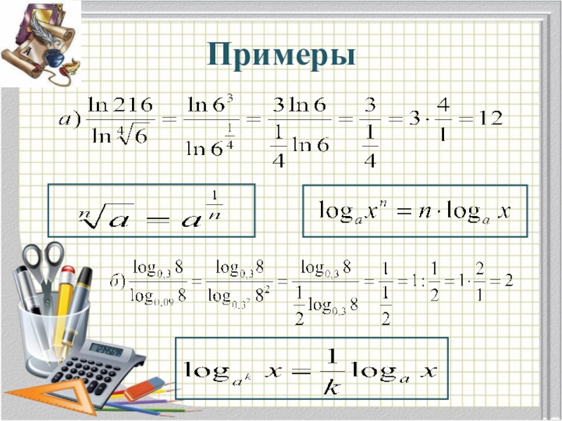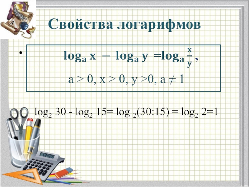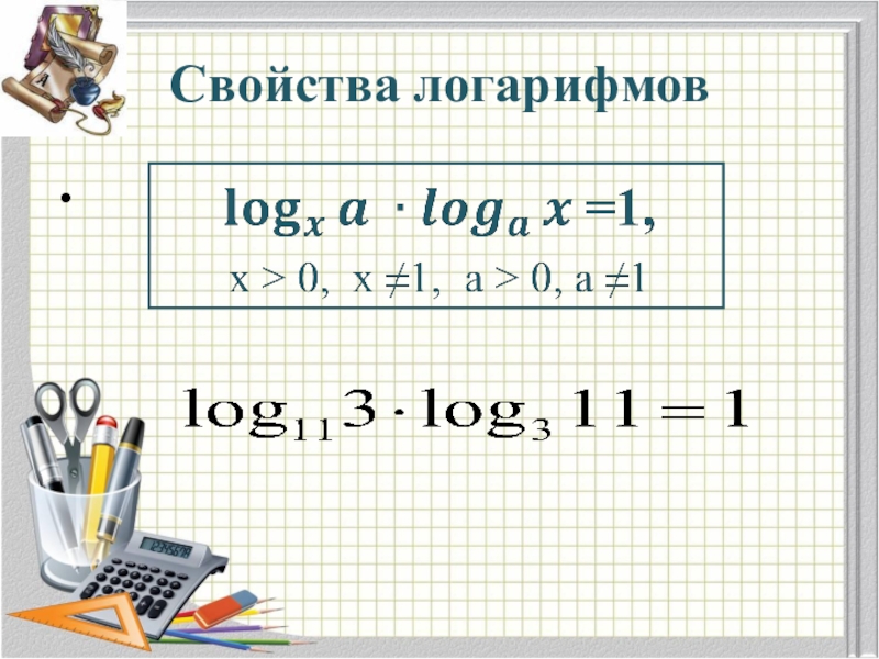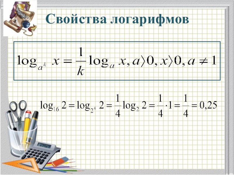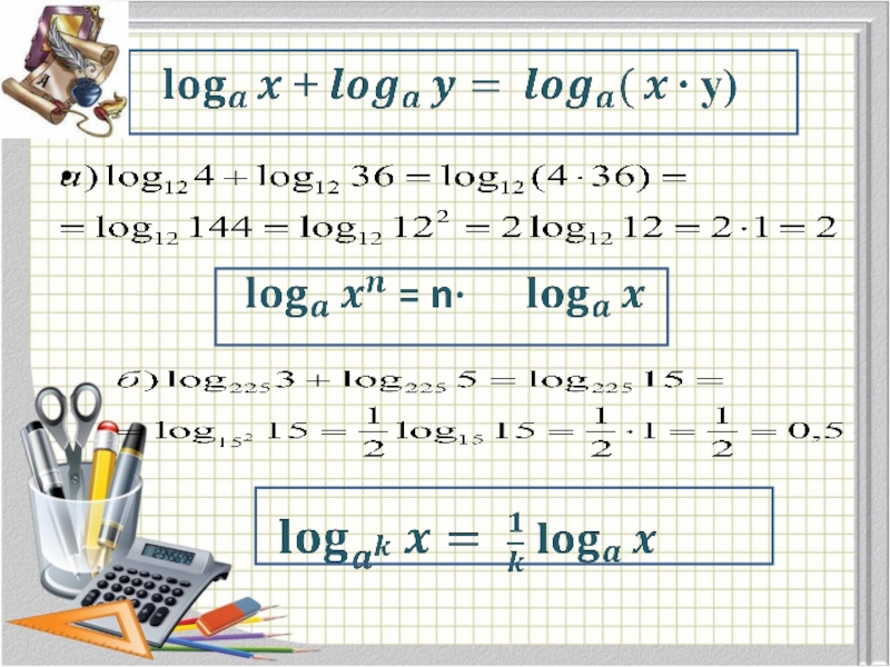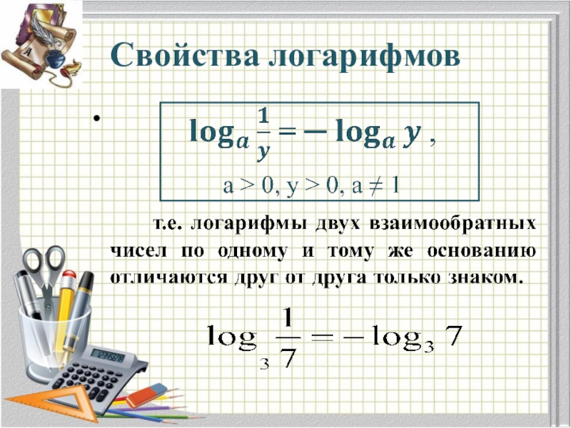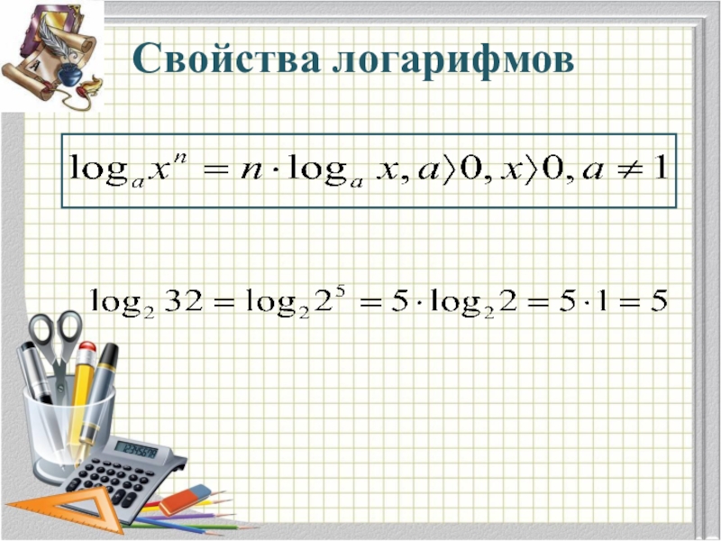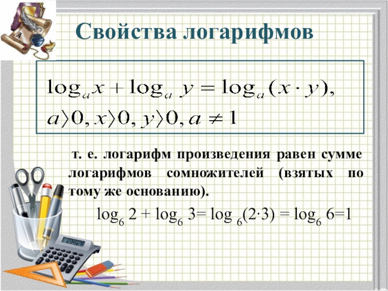 Свойства логарифмов    т. е. логарифм произведения равен сумме логарифмов сомножителей (взятых по тому же