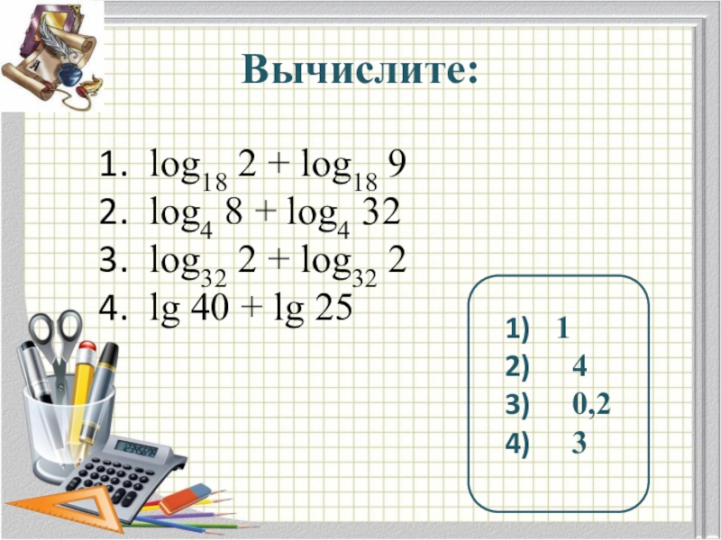 Вычислите:log18 2 + log18 9log4 8 + log4 32log32 2 + log32 2lg 40 + lg 251
