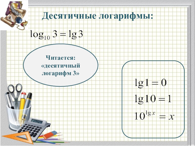 Десятичные логарифмы:Читается: «десятичный логарифм 3»
