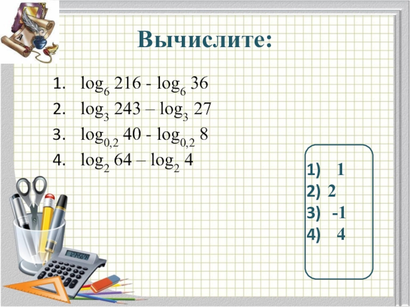 Вычислите:log6 216 - log6 36log3 243 – log3 27log0,2 40 - log0,2 8log2 64 – log2 4