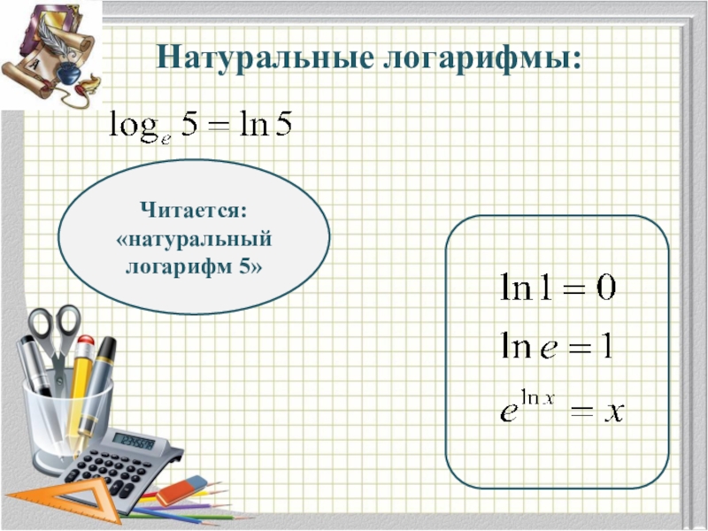 Натуральные логарифмы:Читается: «натуральный логарифм 5»