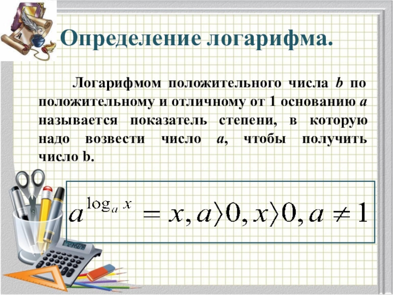 Определение логарифма. Логарифмом положительного числа b по положительному и отличному от 1 основанию а называется показатель степени, в которую надо возвести число а, чтобы получить число b.