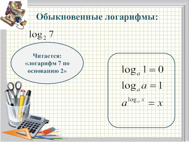 Обыкновенные логарифмы:Читается: «логарифм 7 по основанию 2»
