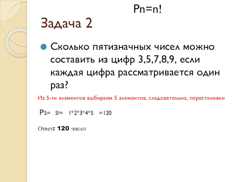 Из 5-ти элементов выбираем 5 элементов, следовательно, перестановки