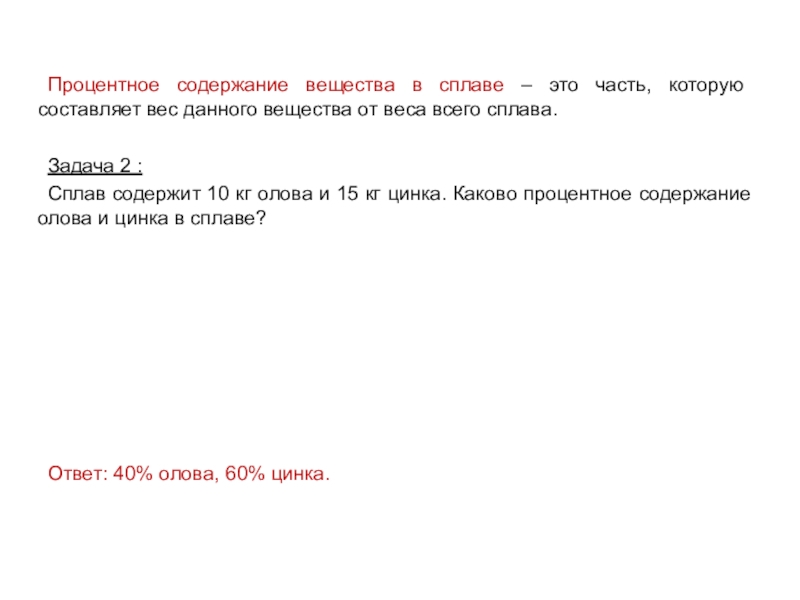 Слайд 18 Процентное содержание вещества в сплаве – это часть, которую составляет вес