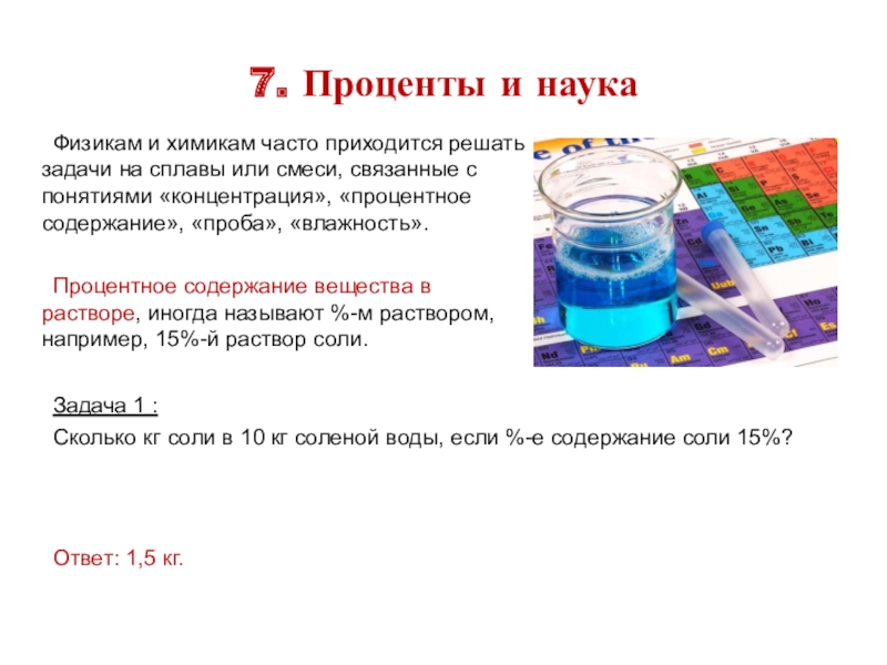 Физикам и химикам часто приходится решать задачи на сплавы или смеси, связанные с понятиями «концентрация», «процентное содержание», «проба», «влажность».