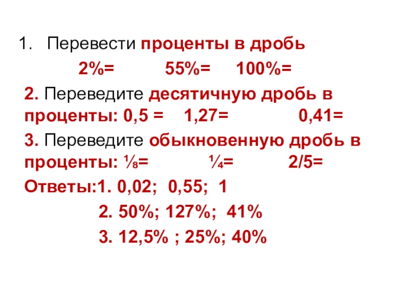 3. Переведите обыкновенную дробь в проценты: ⅛= ¼= 2/5=