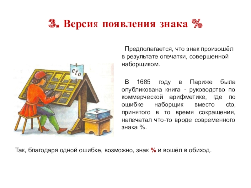 В 1685 году в Париже была опубликована книга - руководство по коммерческой арифметике, где по ошибке наборщик вместо cto, принятого в то время сокращения, напечатал что-то вроде современного знака %.