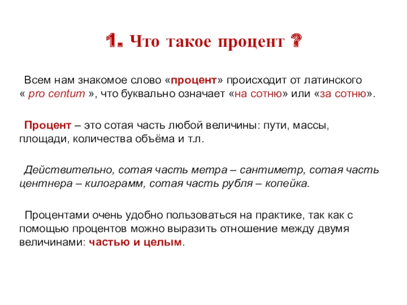 Процент – это сотая часть любой величины: пути, массы, площади, количества объёма и т.л.