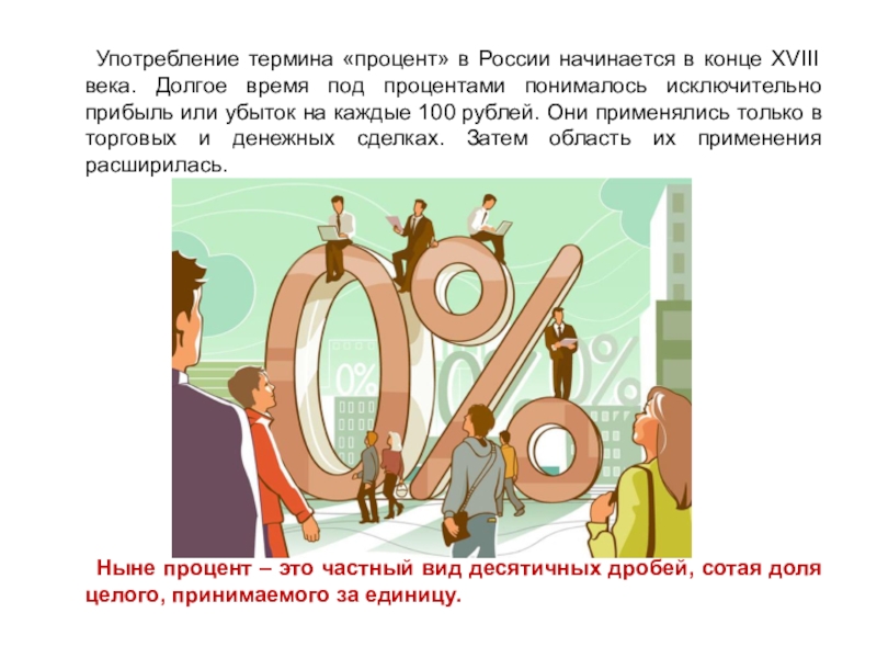 время под процентами понималось исключительно прибыль или убыток на каждые 100 рублей. Они применялись только в торговых и денежных сделках. Затем область их применения расширилась.