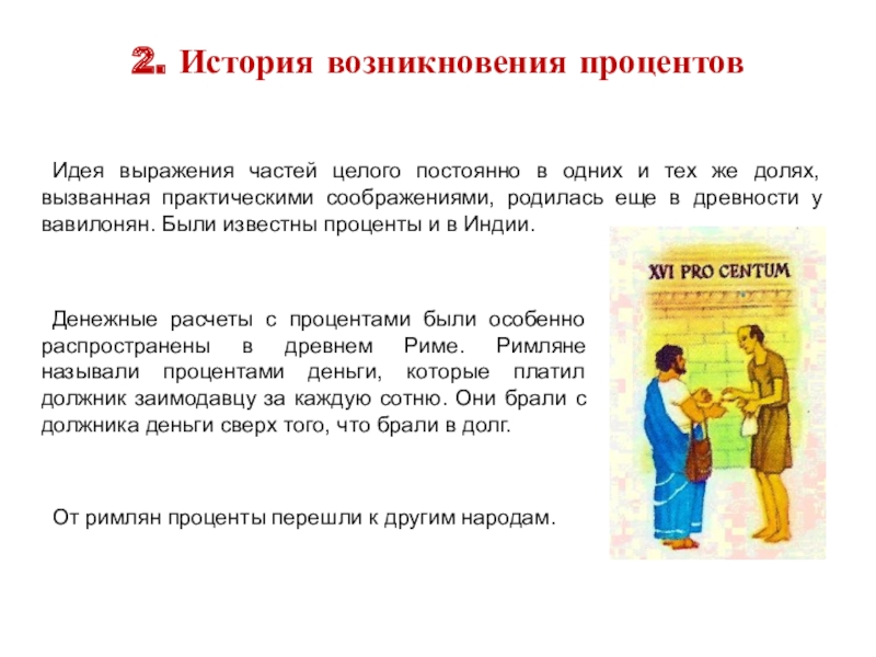 Денежные расчеты с процентами были особенно распространены в древнем Риме. Римляне называли процентами деньги, которые платил должник заимодавцу за каждую сотню. Они брали с должника деньги сверх того, что брали в долг.