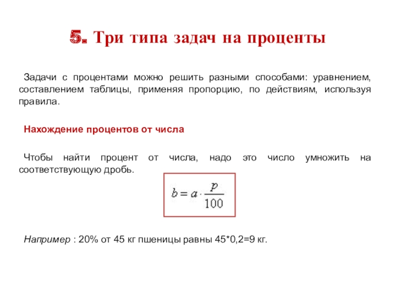 Например : 20% от 45 кг пшеницы равны 45*0,2=9 кг.
