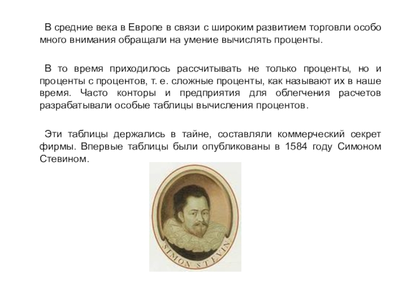 В то время приходилось рассчитывать не только проценты, но и проценты с процентов, т. е. сложные проценты, как называют их в наше время. Часто конторы и предприятия для облегчения расчетов разрабатывали особые таблицы вычисления процентов.