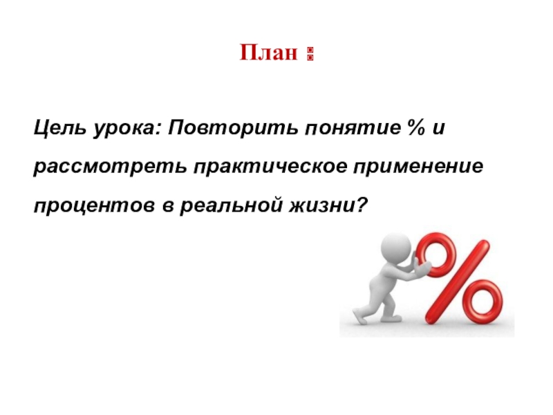 Цель урока: Повторить понятие % и рассмотреть практическое применение процентов в