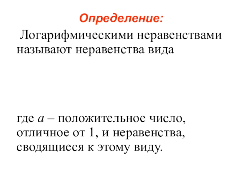 Определение: Логарифмическими неравенствами называют неравенства вида где а – положительное число, отличное от 1, и неравенства, сводящиеся к этому виду.