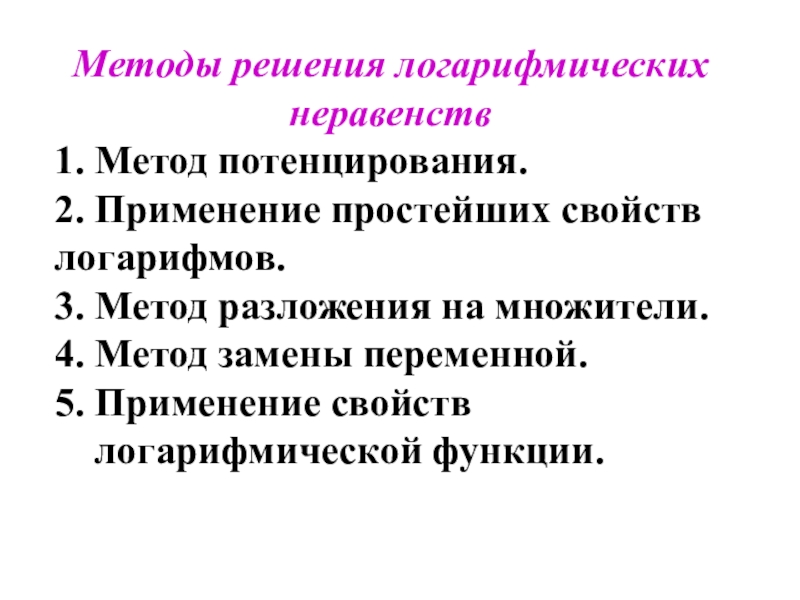 Методы решения логарифмических неравенств1. Метод потенцирования.2. Применение простейших свойств  логарифмов.3. Метод разложения на множители.4. Метод замены