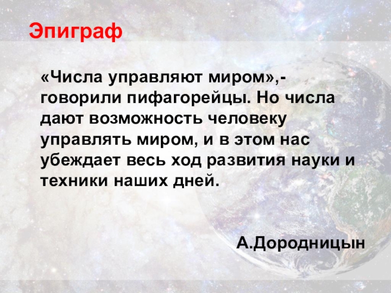 «Числа управляют миром»,- говорили пифагорейцы. Но числа дают возможность человеку управлять миром, и в этом нас убеждает весь ход развития науки и техники наших дней.