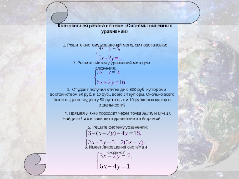 3. Студент получил стипендию 600 руб. купюрами достоинством 50 руб. и 10 руб., всего 24 купюры. Сколько всего было выдано студенту 50-рублевых и 10-рублевых купюр в отдельности?