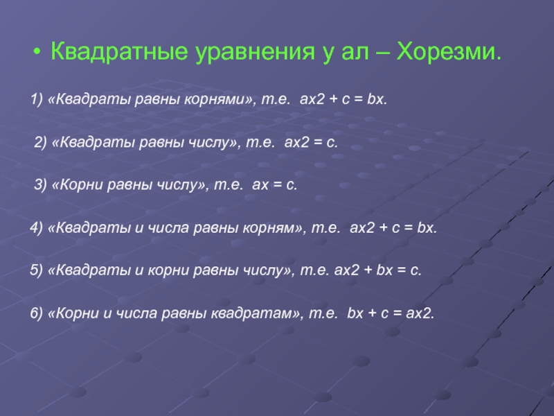 Слайд 5Квадратные уравнения у ал – Хорезми.