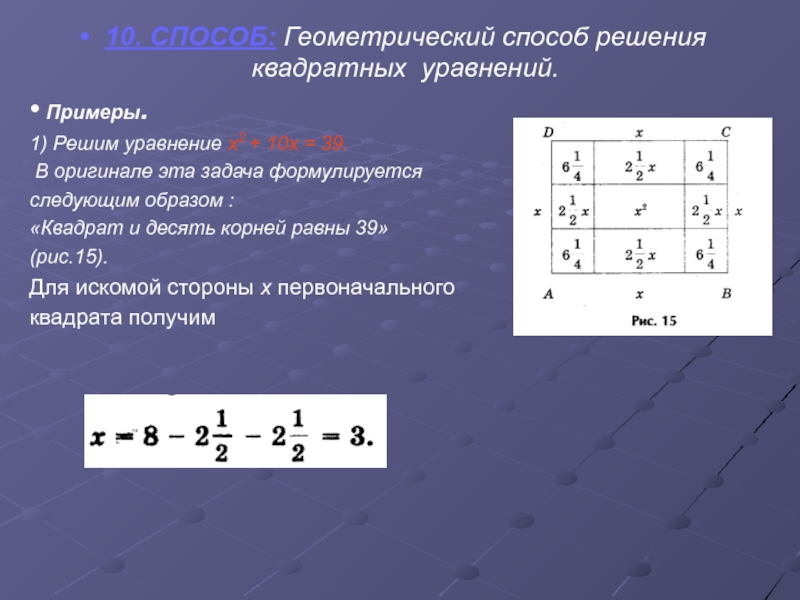 Слайд 2210. СПОСОБ: Геометрический способ решения квадратных уравнений.
