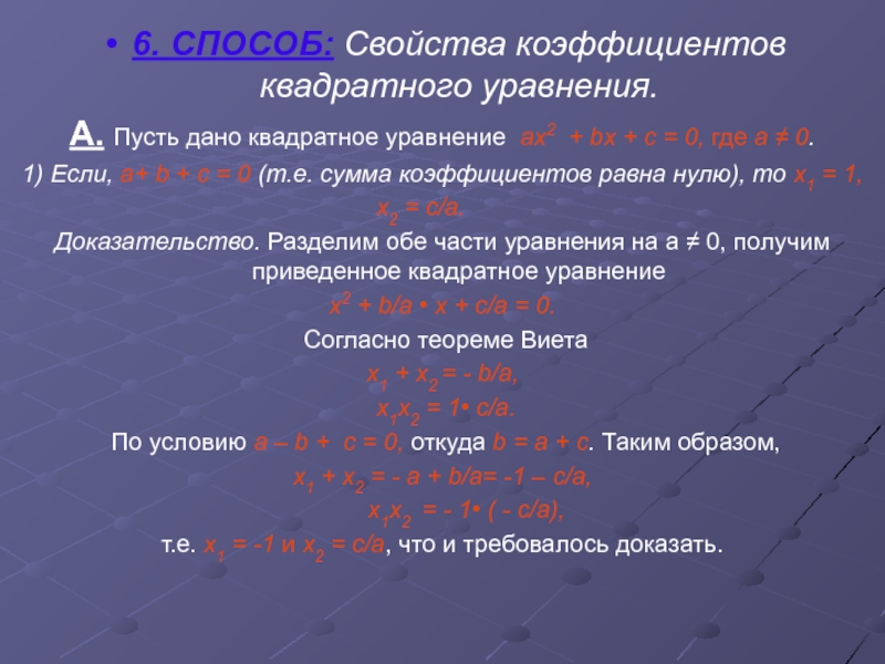 Слайд 146. СПОСОБ: Свойства коэффициентов квадратного уравнения.