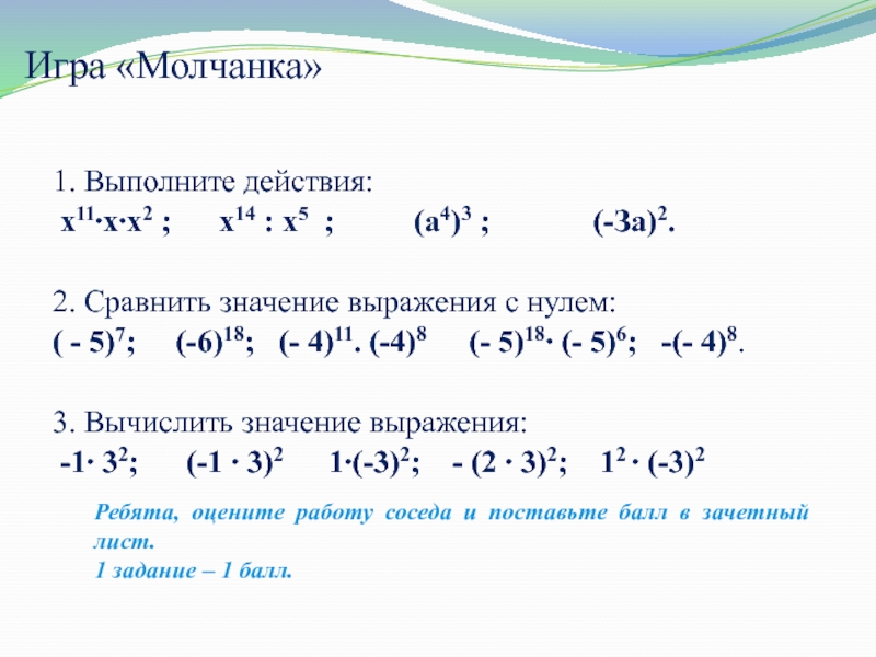 Ребята, оцените работу соседа и поставьте балл в зачетный лист.